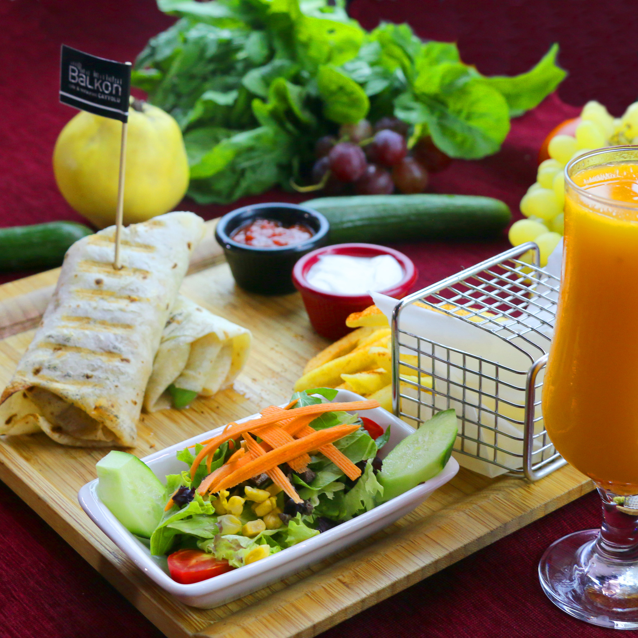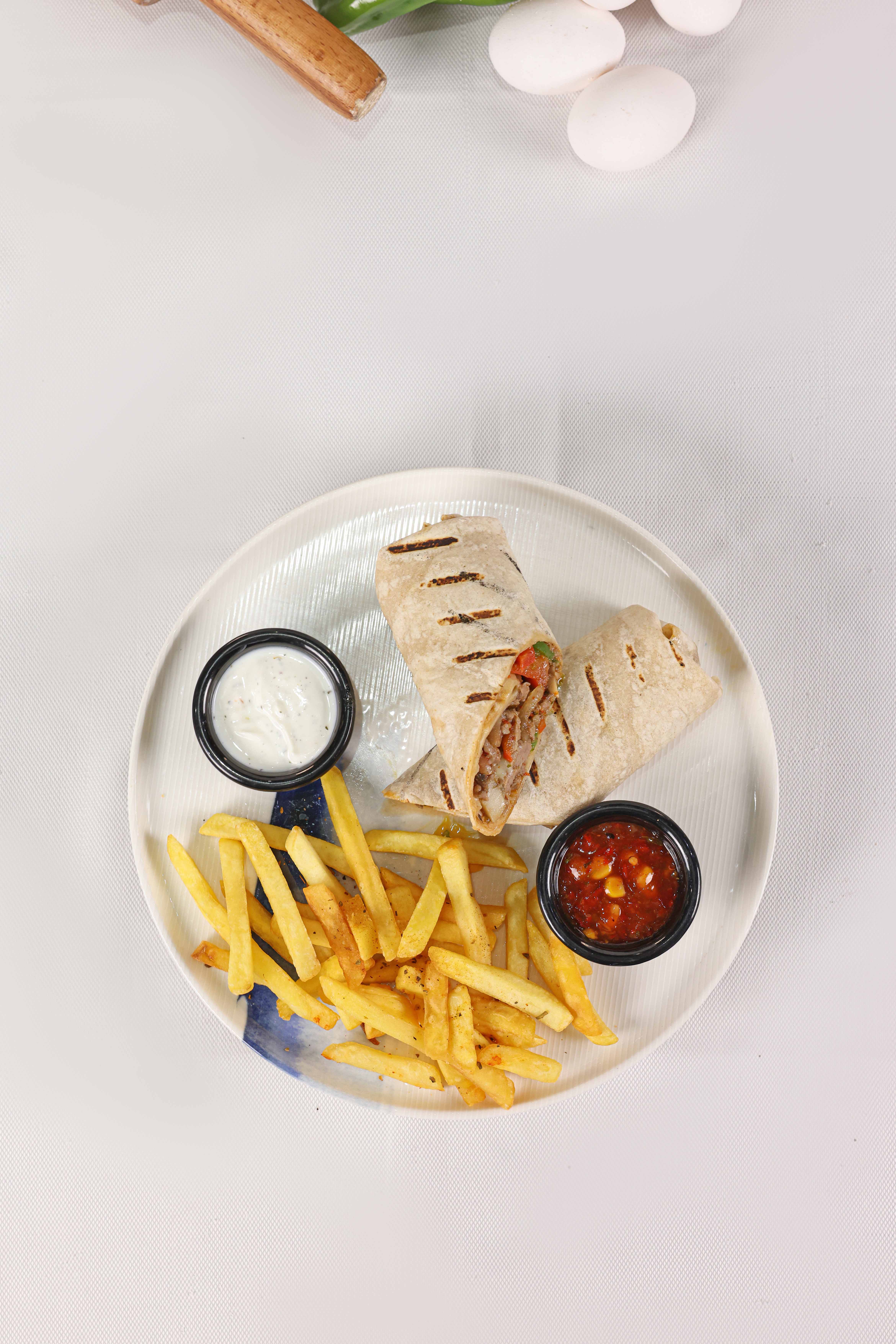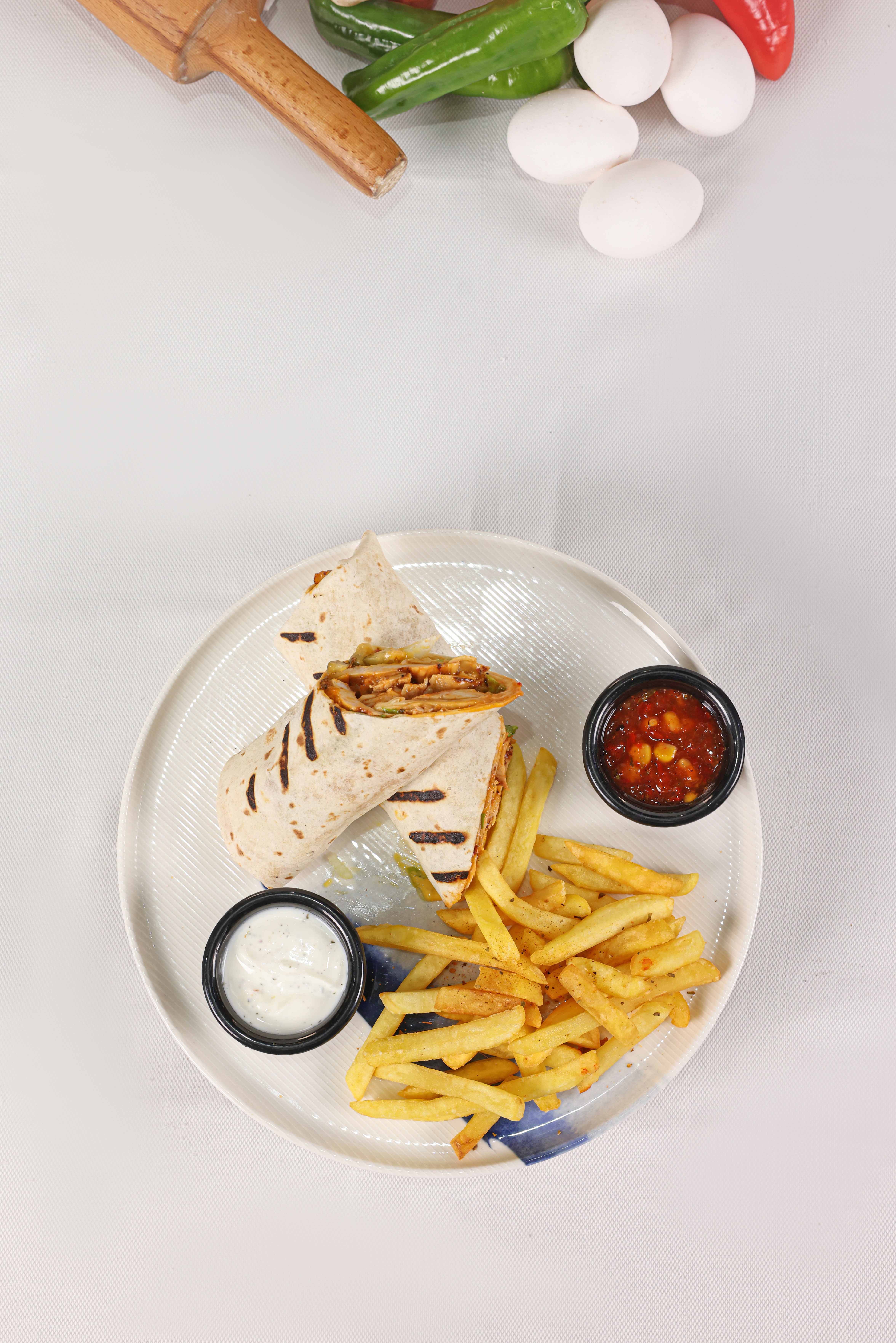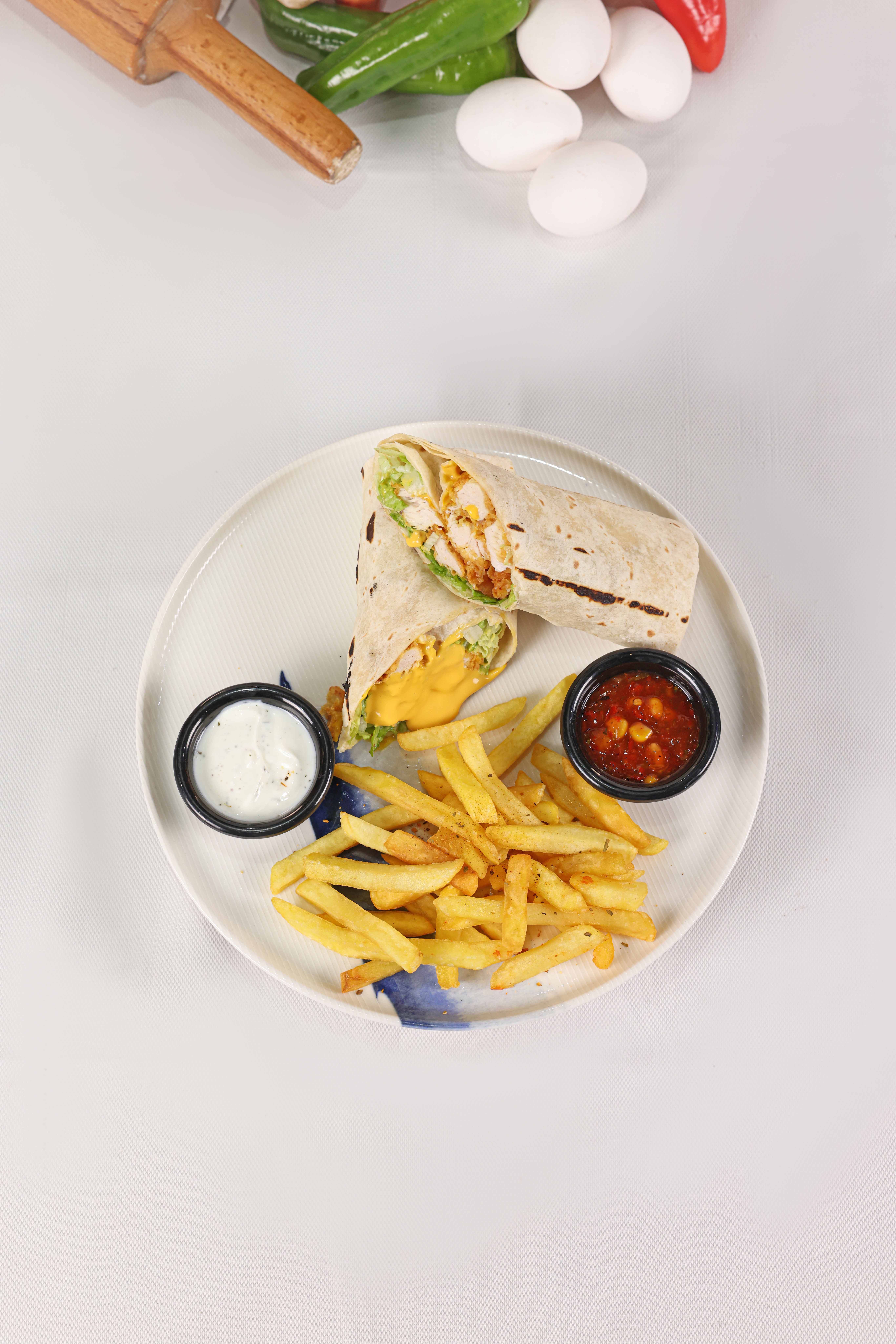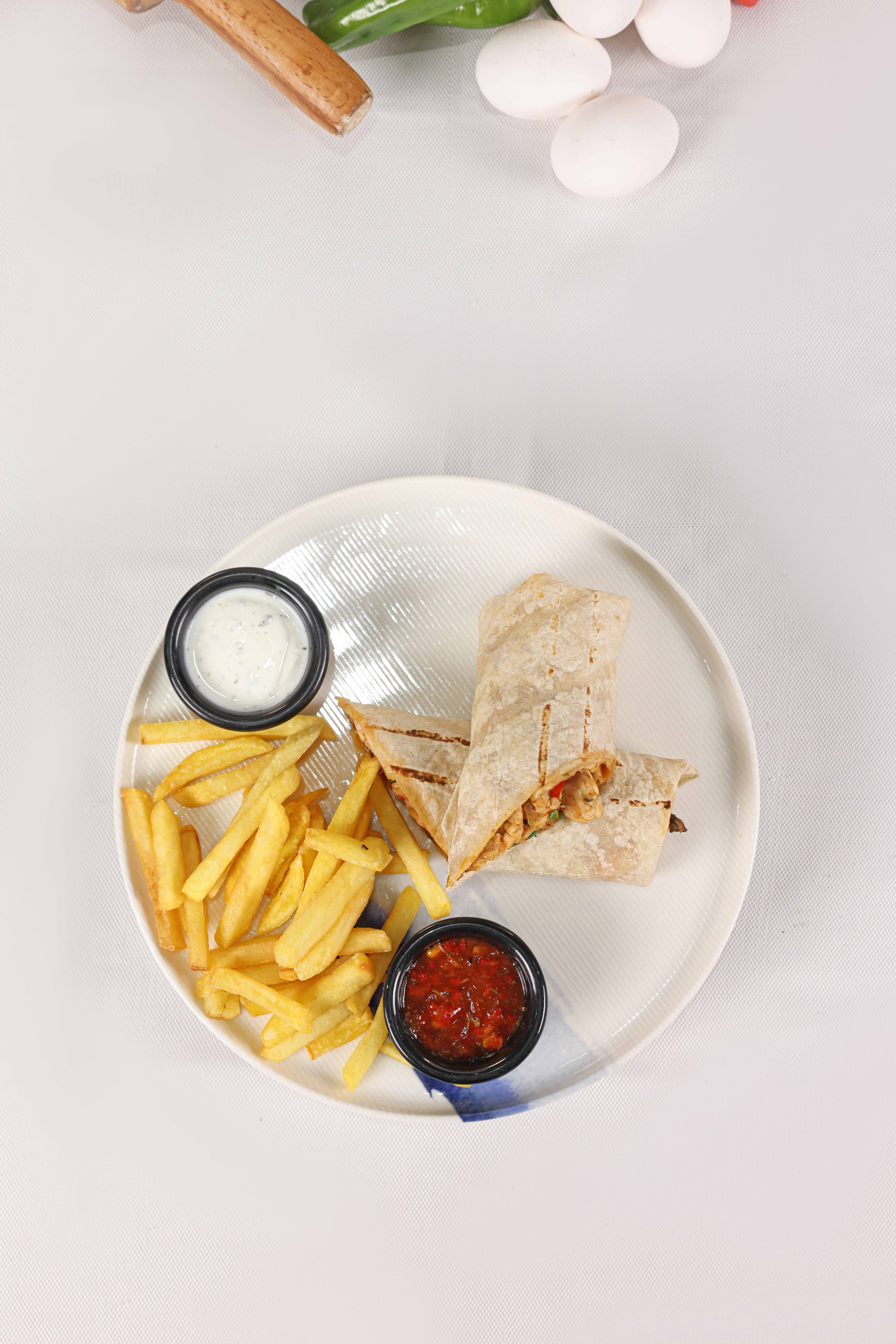 Sımsıkı sarılmış tortilla ekmeği arasında mevsim sebzeleri, kaşar peynir, patates tava, dip sos, piko sos ve yeşillik eşliğinde.