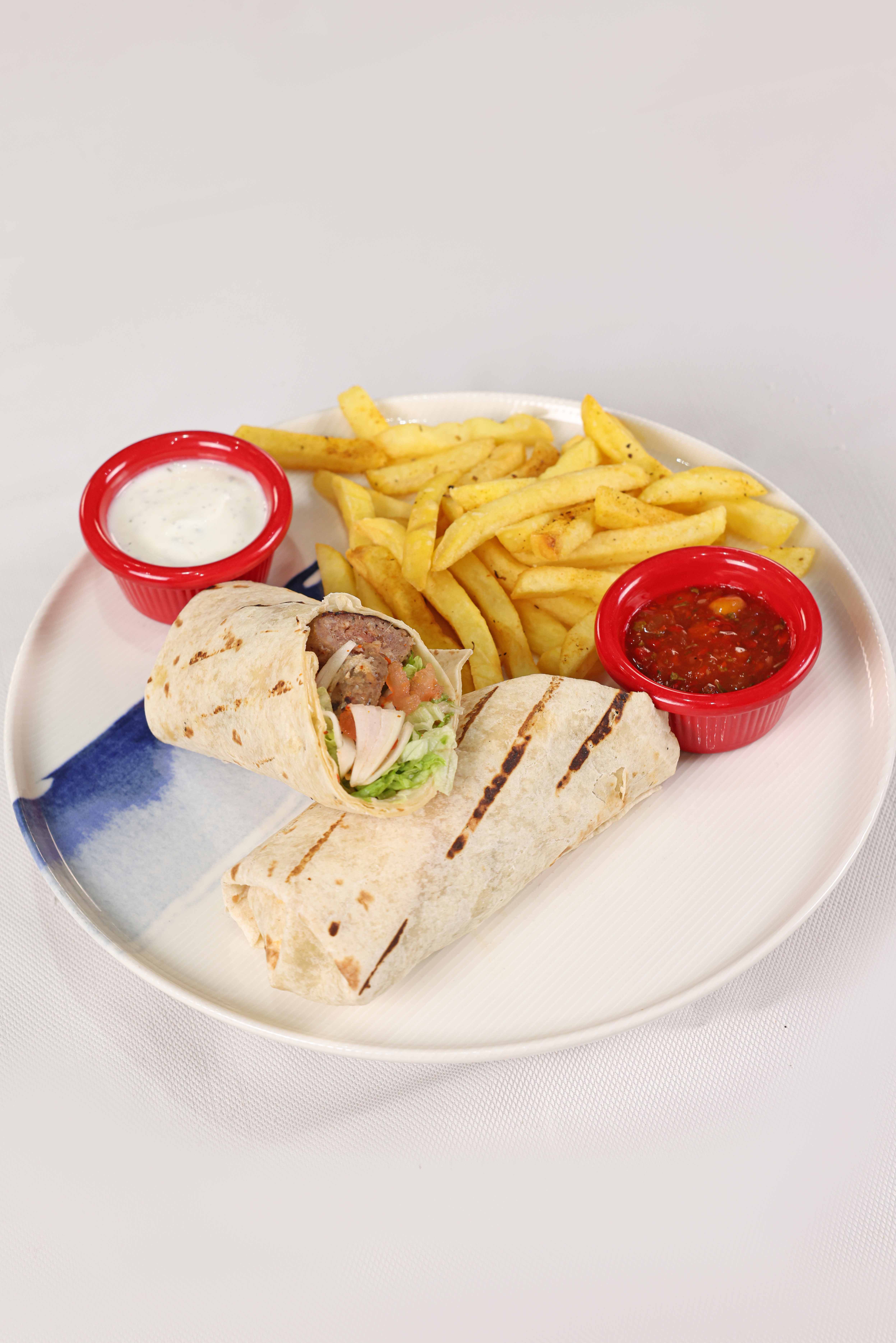 Sımsıkı sarılmış tortilla ekmeği arasında ızgara köfteler, domates, yeşillik, soğan, patates tava, dip sos ve piko sos eşliğinde.